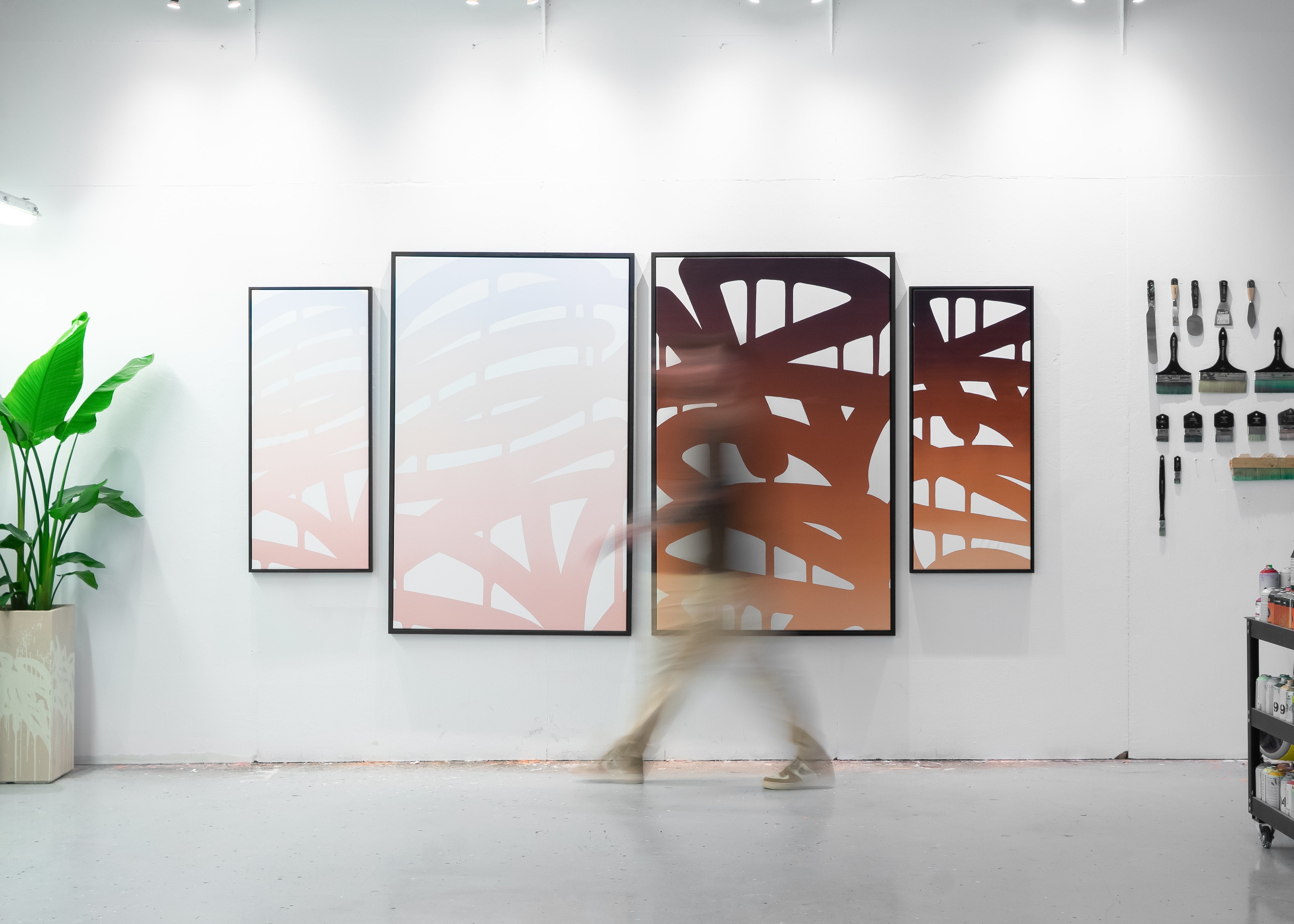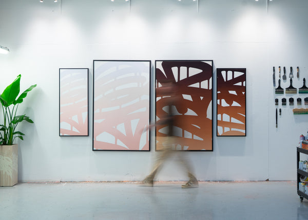 Sunrise and Sunset were created as companion works, capturing two opposing moments of the day. Warm terracotta and morning light meet the cooler lavender and evening tones of the setting sun. Both gradients are built inside bold street-style lettering, creating a contrast between soft atmospheric color and strong graffiti form.